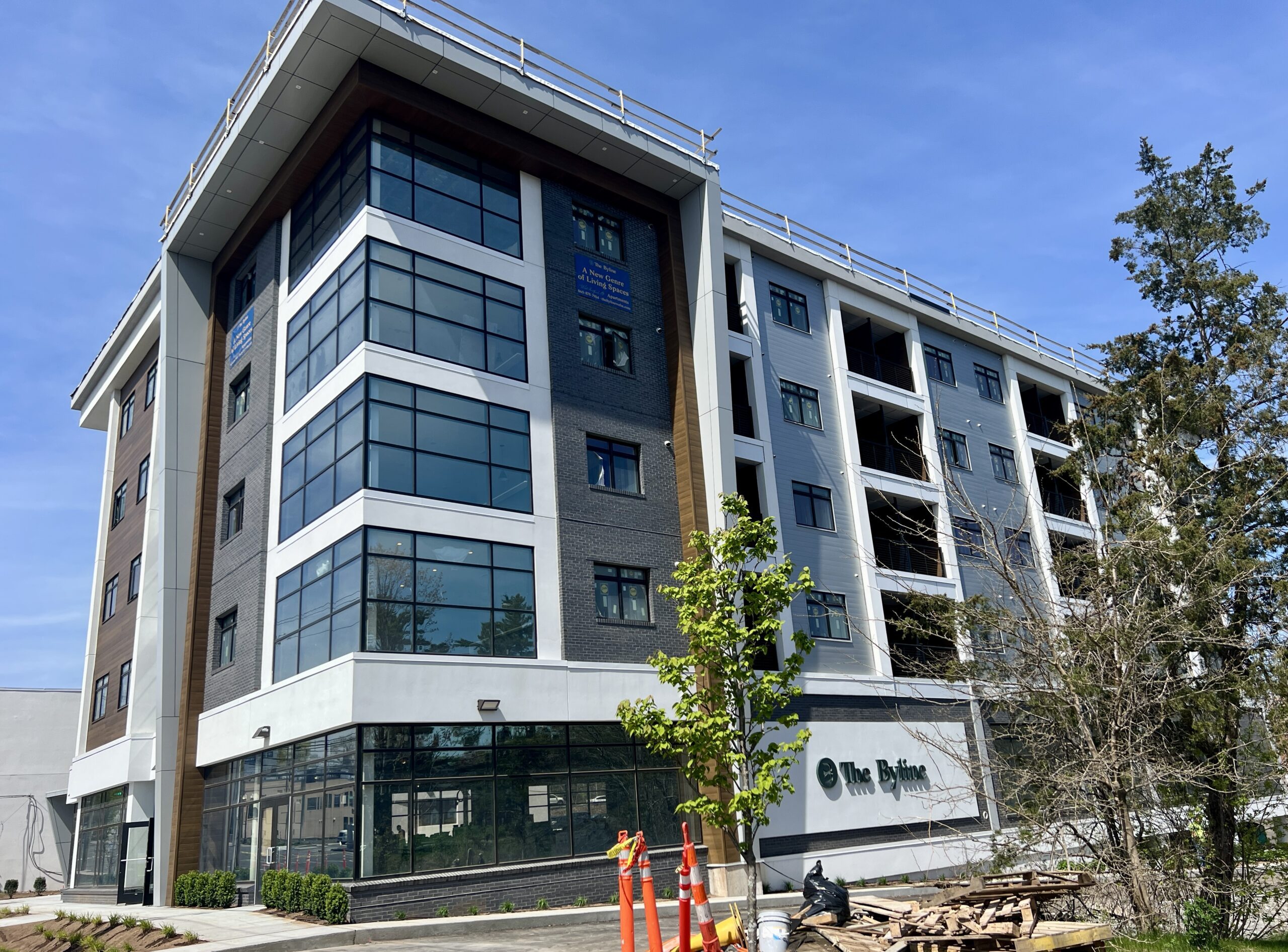 - I’ve been hoping for a while to have a tour of The Byline (920 Farmington Avenue), and was so excited to have that opportunity last Wednesday. Development partners Avner Krohn and Brian Zelman provided were preparing to host prospective tenants that evening, and while the model unit was still being staged and some other items still on order, many of the spaces are complete and according to Krohn, leasing is underway, with the building about 15% leased at this time and occupancy planned for June 1 on the first three levels with the fourth floor expected to be complete sometime in July. The building has 48 units, 36 one-bedroom and 12 two-bedroom, with multiple floorpans, and two of the units are designated and deed-restricted affordable for those earning 80% or less than the area median income (AMI). “We’re hoping to be pretty much leased up in the next 12 weeks,” Krohn said. On the west side of the building there’s a large patio, made from poured-in-place concrete, which will be shaded by a 40-foot pergola as soon as the order arrives. Most of the units have their own balconies as well, and those on the west side of the second floor also have access to an upper-level deck. Inside, the finishes are high-end, with custom millwork accented by gold and brass finishes, and even custom-wallpaper with The Byline’s logo in one area of the lobby. The lobby also includes a lounge with a kitchen, a mailroom, and pets are very much welcome, Krohn said, as he pointed out the dog wash station that’s equipped with hot water sprayers, shampoo, and conditioner. “The idea here is for it to feel like the Upper East Side of Manhattan,” Krohn said, and to create a small, niche community the building with an urban aesthetic feel. Smart technology is in place, with tenants able to use their phones to control the HVAC and other systems. The finishes – quartz countertops, stainless steel appliances, floor-to-ceiling tile in the expansive bathrooms, and closet systems – are “condo-level finishes,” Krohn said. The target market is young professionals, as well as people downsizing who may want to retain a residence in West Hartford. Krohn said his favorite units are the four on the southeast corner of the building, which feature floor-to-ceiling windows supported by structural steel. The project took more than two years to complete, complicated by supply issues for some of the exterior façade materials, but they are pleased with the results. The Byline is offering a curated package for future residents that includes discounts at area businesses (include preferred rates at the Delamar for their out-of-town visitors), and designer services and discounts from Jordan’s Furniture, which is also supplying the furniture for the model unit. “They already have all of the floor plans,” Zelman said, and are ready to assist with furnishing units. One or more commercial tenants will eventually occupy the roughly 10,000 square foot ground floor space, and there are several prospective tenants looking at it, said Krohn, who confirmed it will not be a restaurant. For more information, or to schedule a tour or receive details about rental rates, visit the website.